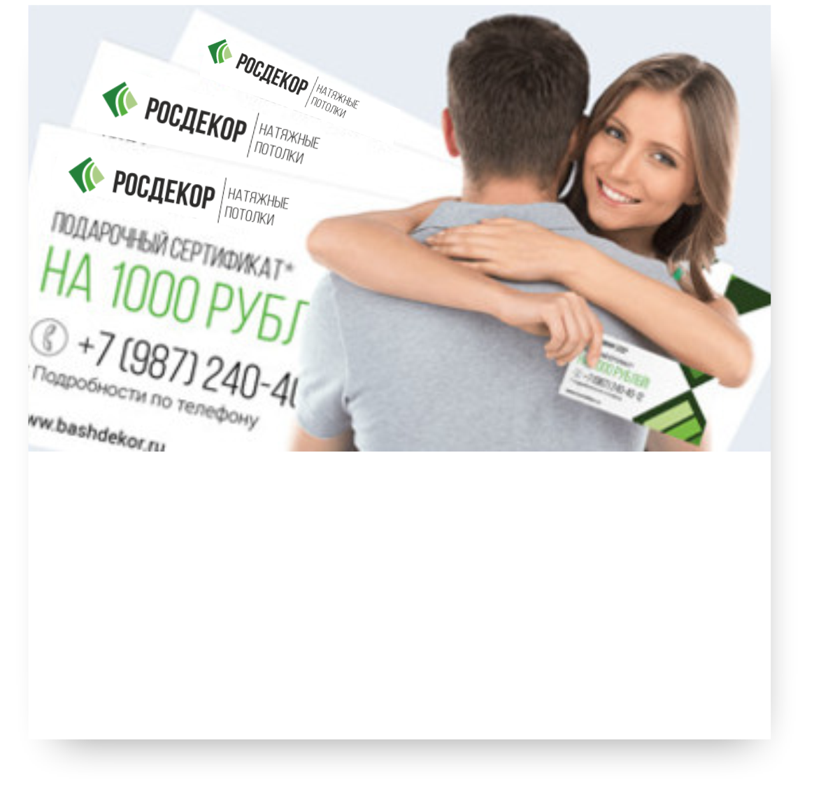 Вы можете получить сертификат на 1000 рублей, есть скидки для пенсионеров и карты любимого клиента. А также в магазинах партнерах есть возможность получения квадратного метра в подарок. На полотна стандарт класса действует скидка 50%, что будет, несомненно, оценено экономными покупателями. Изготовление и монтаж натяжных потолков по акции со скидками является формой взаимовыгодного сотрудничества компании и клиентов. Мы лояльно относимся к старым и новым заказчикам, надеясь на долговременные отношения!